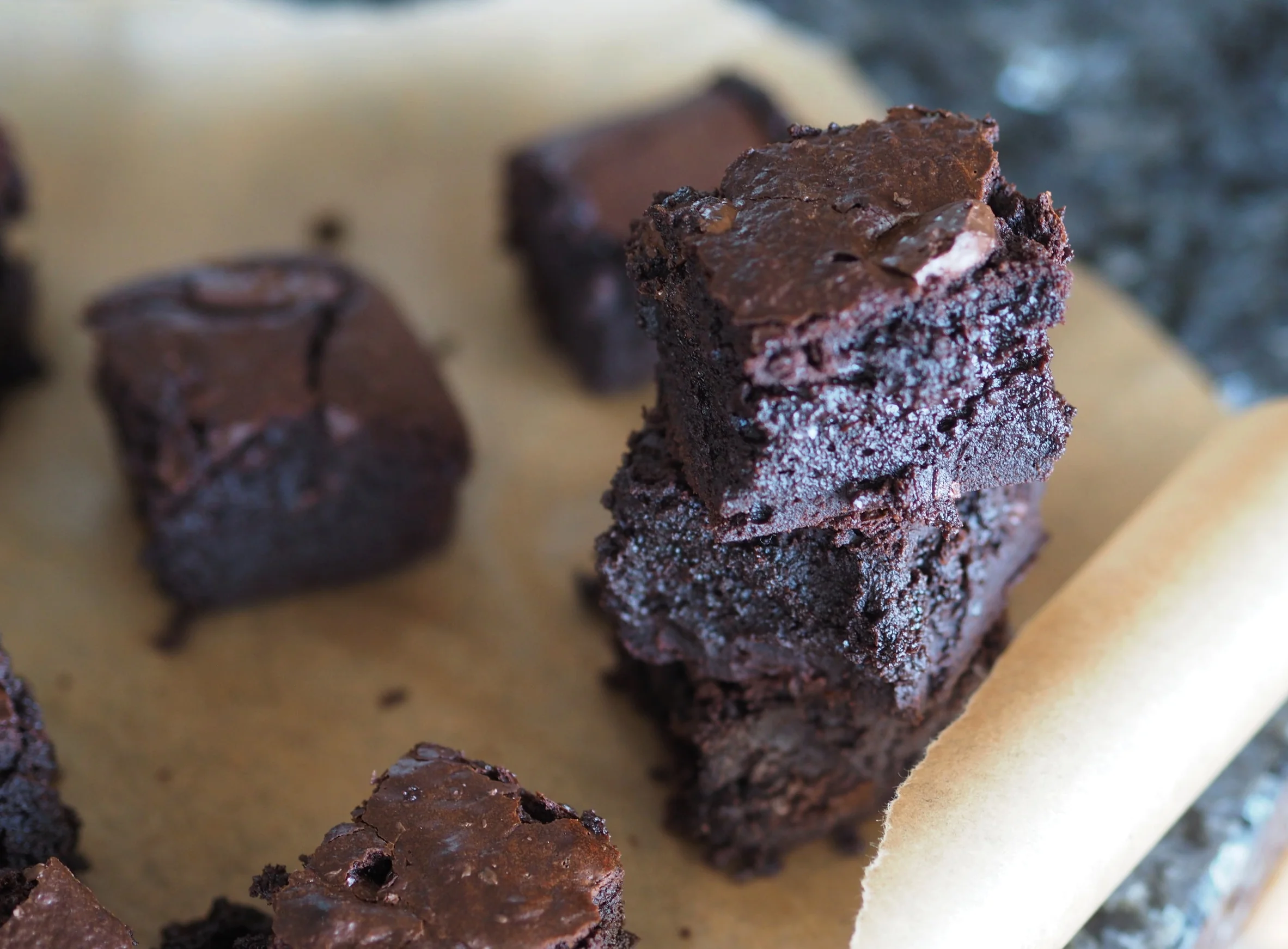 3. Stir the eggs into the mix one by one, add the flour and cocoa, (If your adding raspberries of anything mix half of them in now). Scrape into the tray, then scatter the chocolate chunks (or swirl on the peanut butter/ salted caramel) on top. Bake on the middle shelf for 30 mins. If its still a little wobbly in the middle when you move the tin or you'd like then a little firmer, turn the oven down to 160 C and leave another 5-10 mins. Cool before slicing into squares.